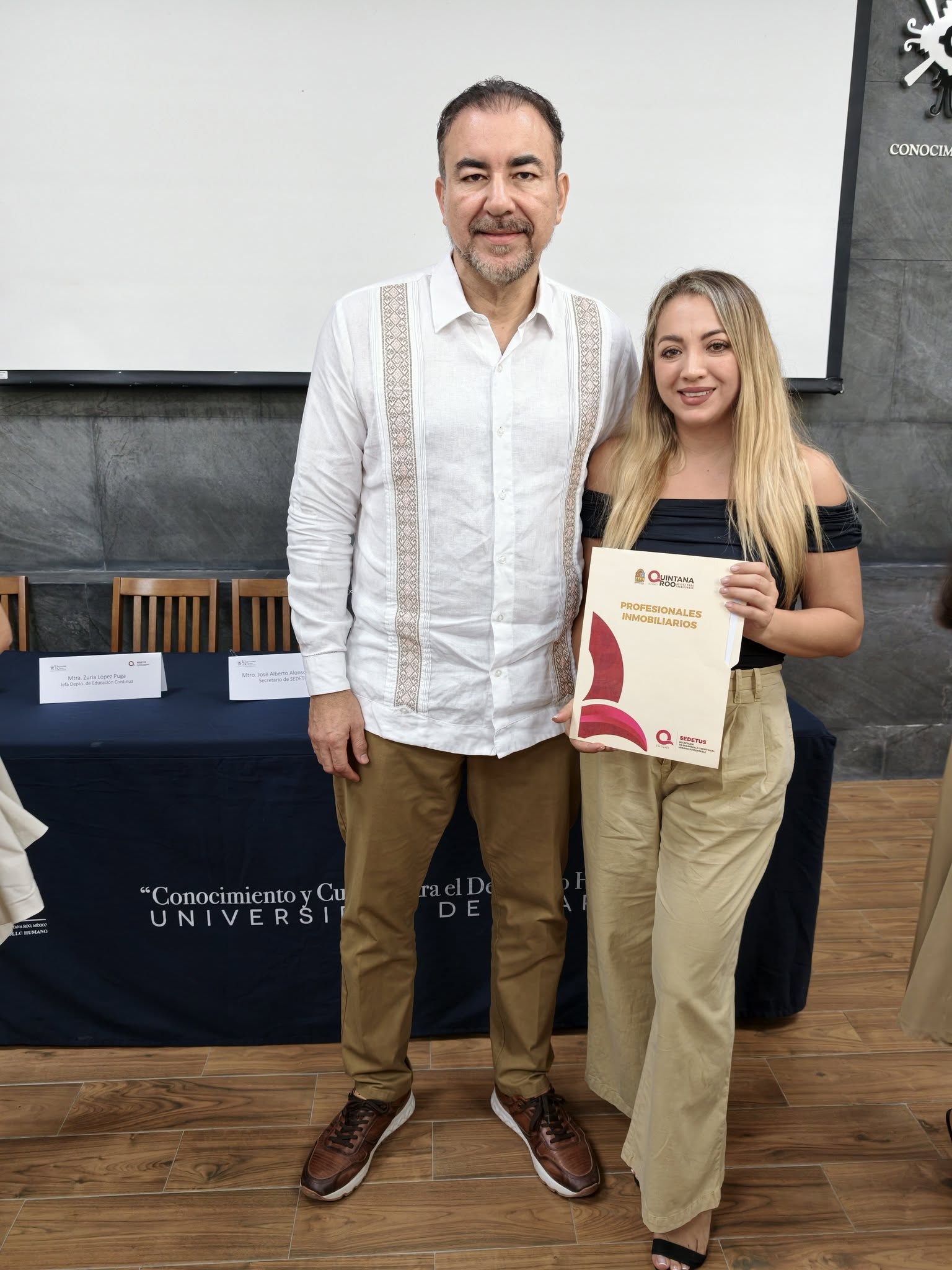 Durante la ceremonia, el secretario Alonso Ovando estuvo acompañado por Xóchitl Carmona Bareño, rectora de la Universidad del Caribe, y Zuria López Puga, jefa del Departamento de Educación Continua, quienes destacaron la importancia de la vinculación académica en la formación de especialistas del ramo. Asimismo, en representación del gremio de asesores, participaron Asan Moises Aranda Godoy y Elizabeth Jiménez, quienes subrayaron el compromiso de los profesionales inmobiliarios por mantenerse actualizados y cumplir con las normativas vigentes en la entidad.